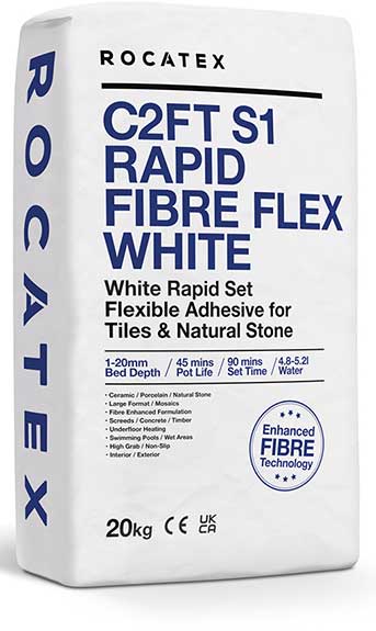 ROCATEX C2FT S1 Rapid Flex White is a single part, flexible wall and floor tile adhesive for fixing natural stone and tiles including ceramics, porcelain and mosaics to a variety of substrates. Suitable for interior and exterior use.