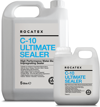 A high performance VOC free water-based impregnating sealer designed using the very latest technology in fluorochemistry. This versatile and easy to apply penetrating and invisible sealer provides a durable, non-filmforming protective barrier on porous acid sensitive surfaces including polished and unpolished natural stone, grout joints, paving, concrete and render. ROCATEX C-10 Ultimate Sealer allows the surface to breathe and provides excellent oil, grease and water repellency, stain resistance and ease of cleaning.